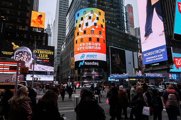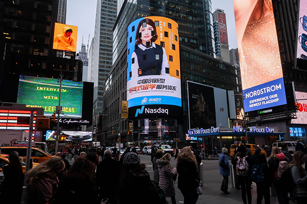 美国东部时间2019年12月4日,环外留学应邀登陆纳斯达克巨屏,在“世界的十字路口”打开了通往留学世界的大门,也向全世界证明了其在新加坡和马来西亚留学领域的实力和影响力。