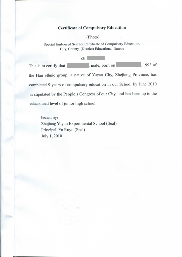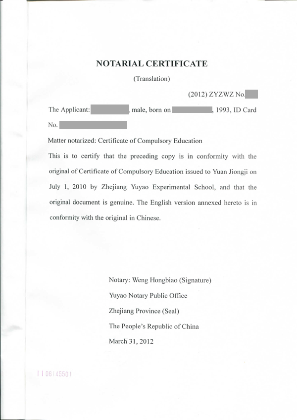4、初中毕业证公证书原件。 [初中毕业证、英文、初中毕业证公证书、英文]